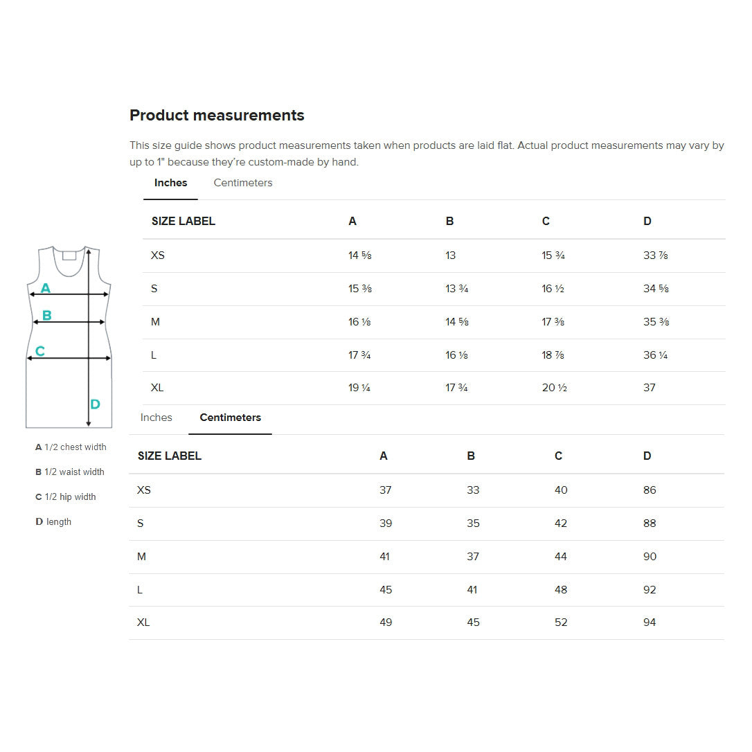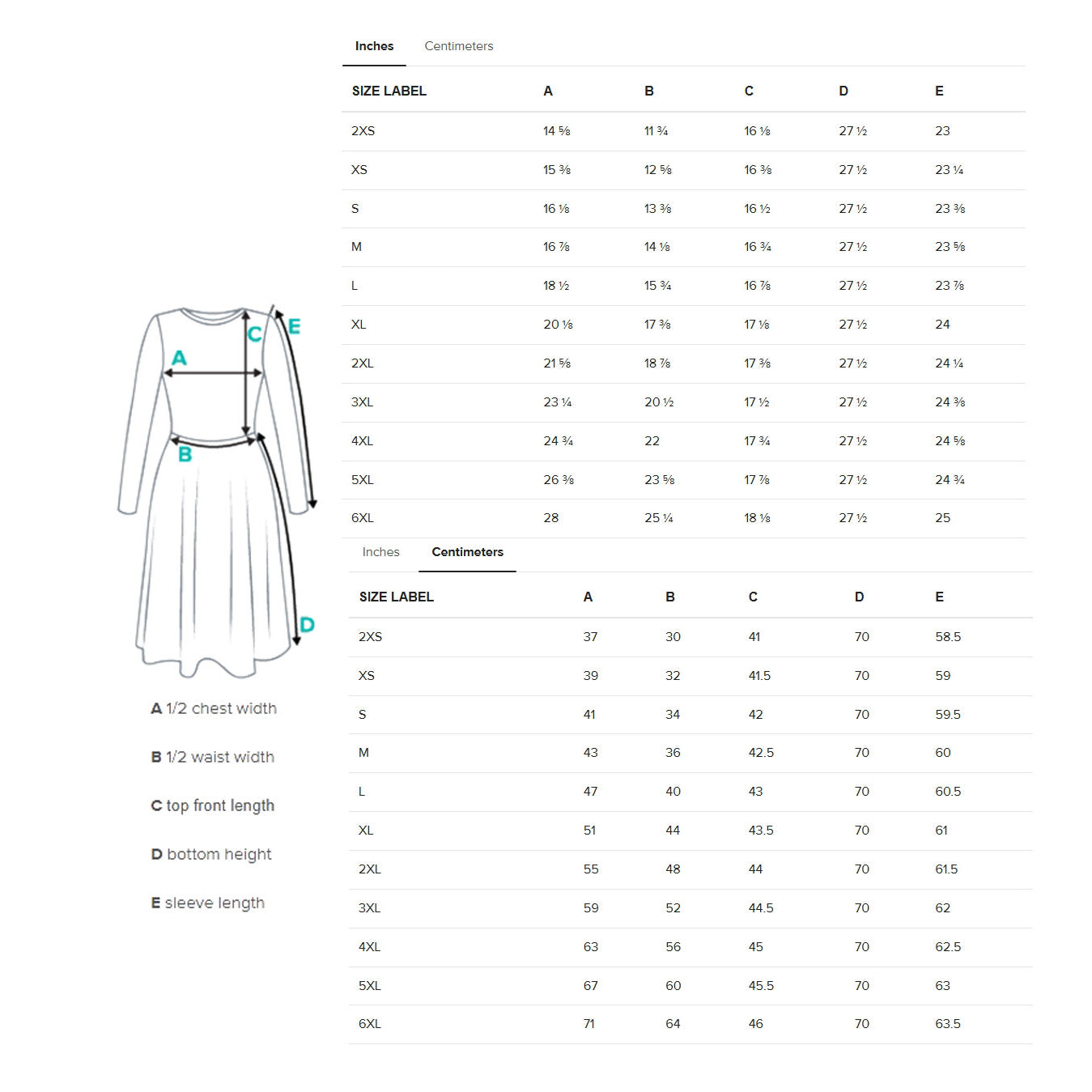Size charts in inches and centimeters.